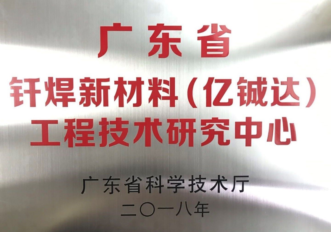 2018年12月19日,經(jīng)廣東省科學(xué)技術(shù)廳批準(zhǔn),設(shè)立“廣東省釬焊新材料(億鋮達(dá))工程技術(shù)研究中心”。2019年1月18日研究中心正式掛牌成立。該中心為省級(jí)釬焊新材料重點(diǎn)研究中心,研究中心的成立彰顯了億鋮達(dá)在釬焊新材料領(lǐng)域的重要地位。